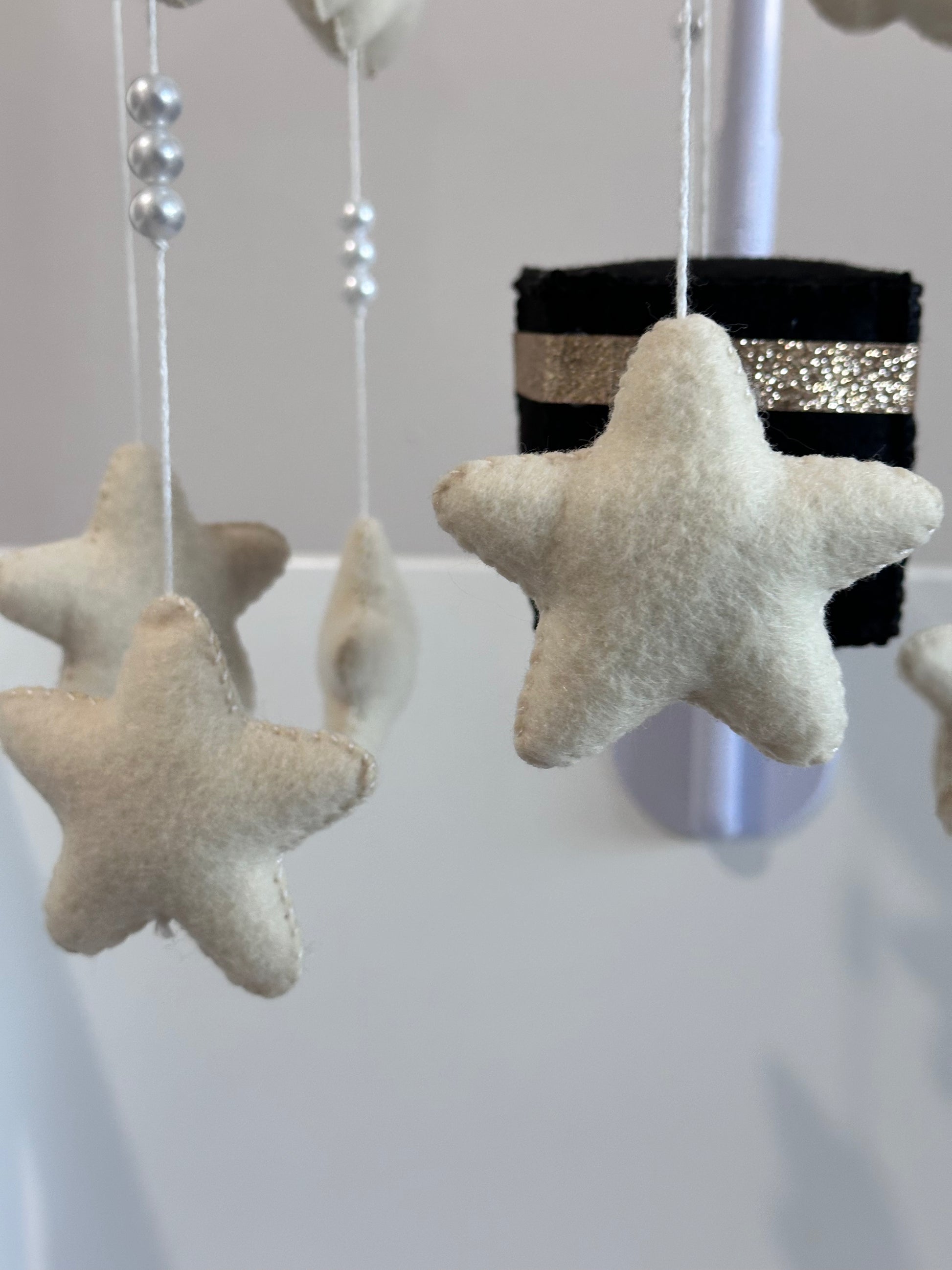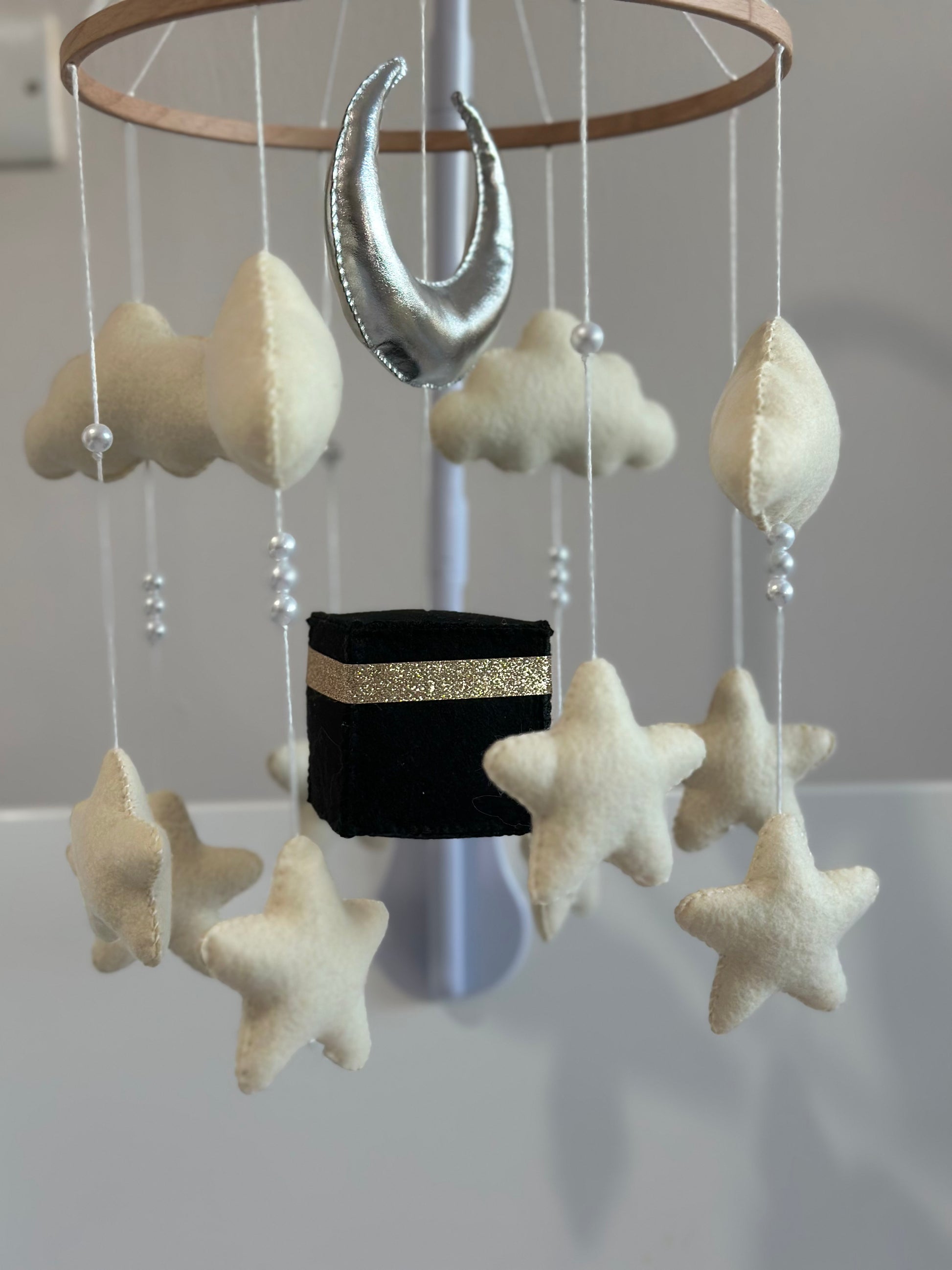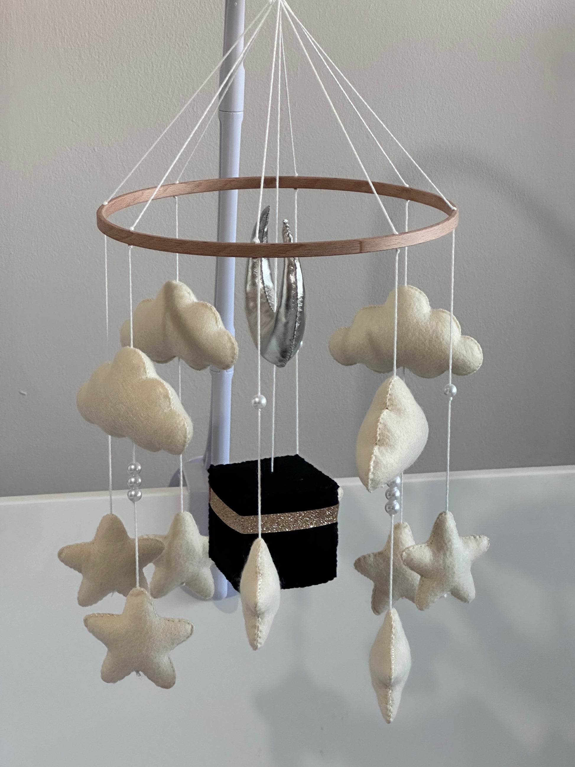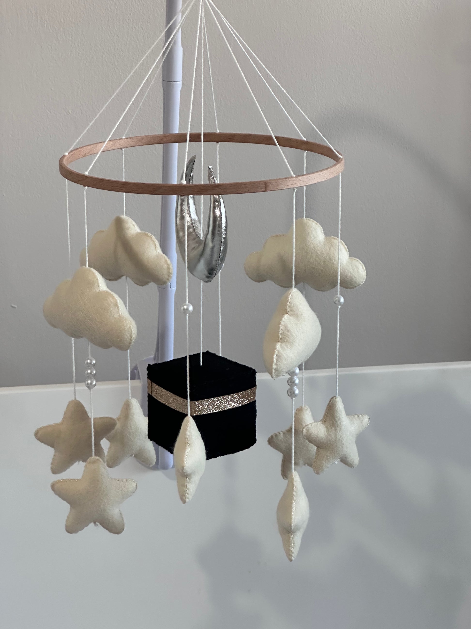 Create a serene and meaningful atmosphere in your baby’s nursery with this beautifully handcrafted Islamic baby crib mobile. Inspired by the Kaaba in Makkah, this mobile features soft plush elements, including a crescent moon, stars, clouds, and pearls, making it the perfect addition to any Muslim baby’s room.